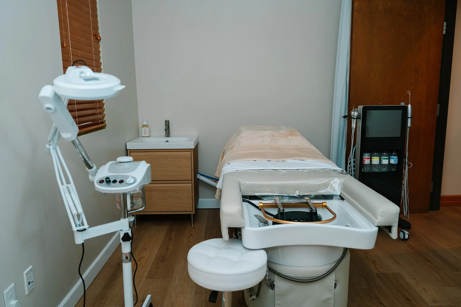 The room is private or softly lit with calming music, creating a serene, spa-like atmosphere.